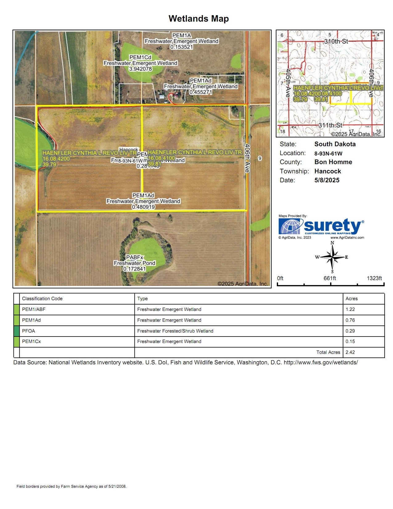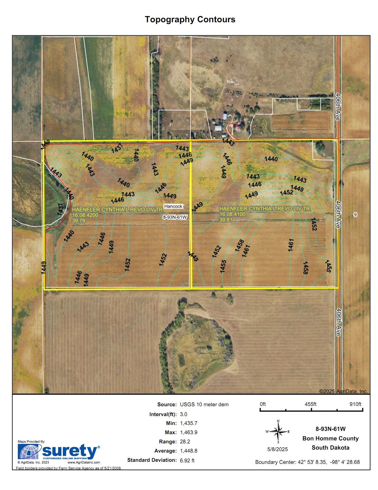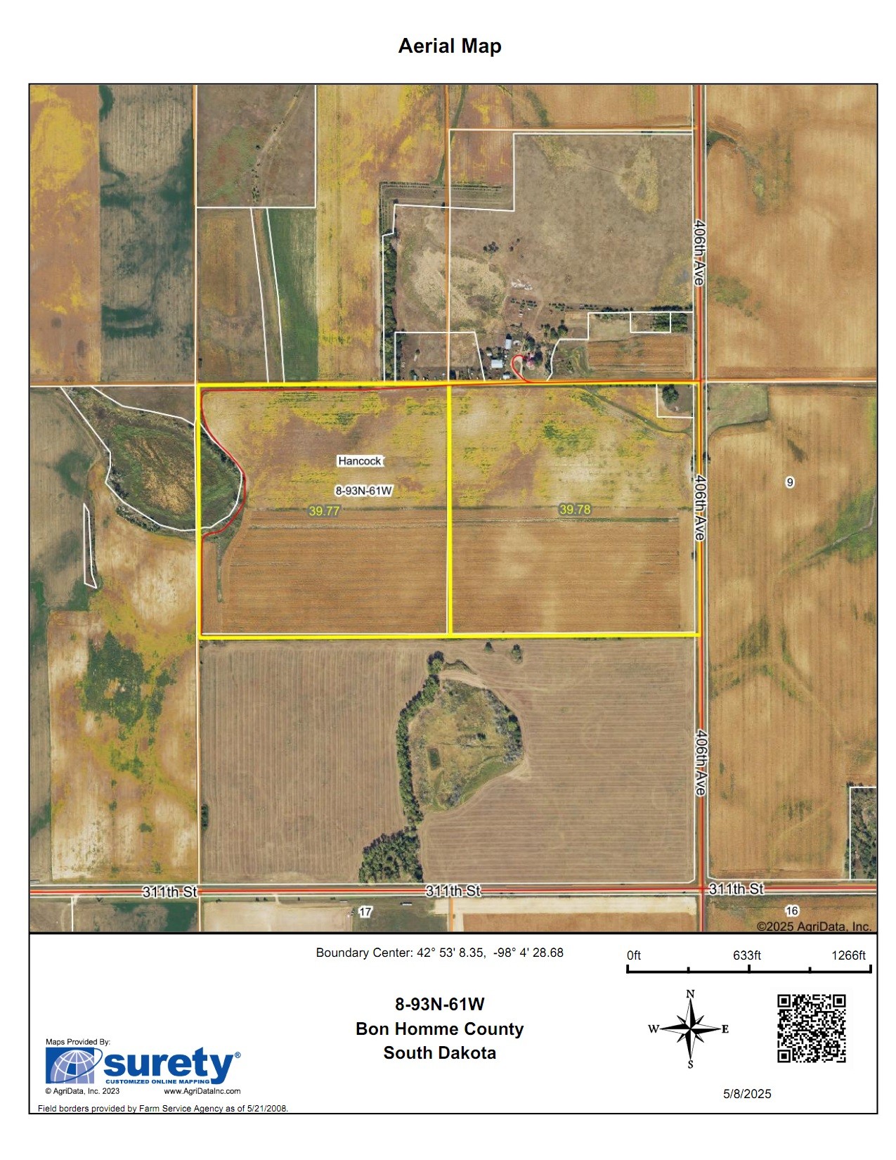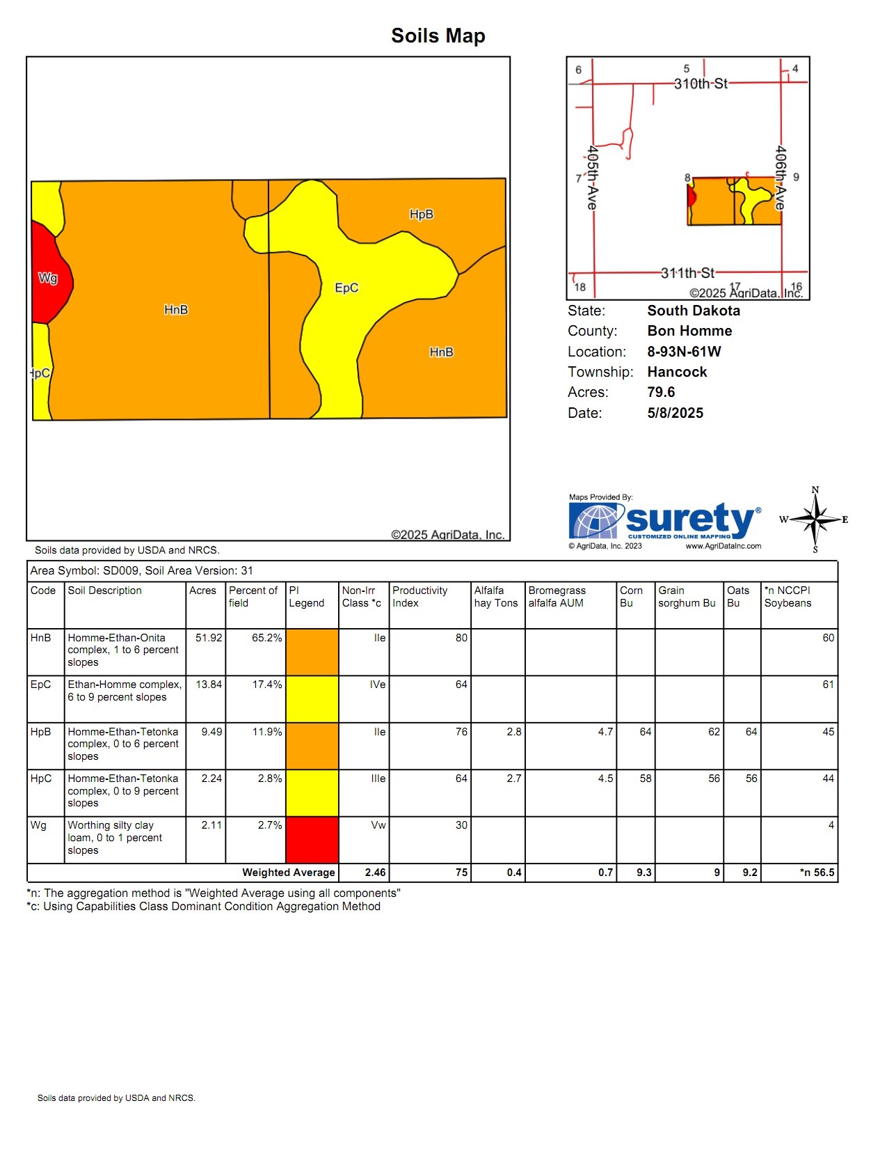 UP FOR PUBLIC AUCTION ON JUNE 4TH @ 10:00 AM IS 79 +/- ACRES OF HANCOCK TOWNSHIP, BON HOMME COUNTY AGRICULTURAL GROUND. ACCORDING TO SURETY AGRIDATA SYSTEMS THIS LAND BOASTS A PRODUCTIVITY RATING OF 75 WITH SLOPES OF 0 TO 6 PERCENT THROUGHOUT WITH THE PREDOMINATE SOILS BEING HOMME-ETHAN-ONITA COMPLEX, ETHAN-HOMME COMPLES, & HOMME-ETHAN-TETONKA COMPLEX. THIS PARCEL OF REAL ESTATE IS MOSTLY TILLABLE AND HAS HAD EXCELLENT FARMING AND ROTATION PRACTICES EMPLOYED. THIS TRACT DOES CONTAIN A SMALL CERTIFIED WETLAND. THERE IS EXCELLENT ACCES AND THIS REAL ESTATE IS LOCATED NEAR SEVERAL LOCAL GRAIN MARKETS. THIS PROPERTY IS UNDER LEASE FOR THE 2025 GROWING SEASON. IF YOU ARE LOOKING TO ADD TO YOUR CURRENT FARMING OPERATION OR INVESTMENT PORTFOLIO THIS IS A PROPERTY YOU ARE CERTAINLY GOING TO WANT TO CHECK OUT. FOR MORE INFORMATION CONTACT CODY PETERSON @ 605-682-1652.